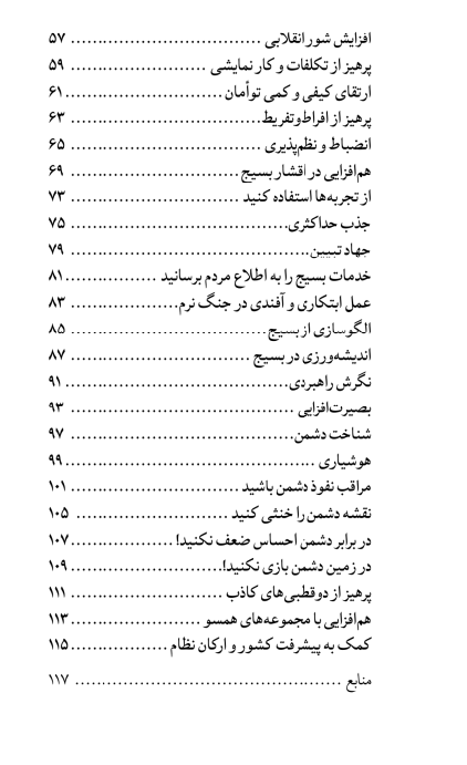 این کتاب در 120 صفحه و 40 عنوان(بخش) بر اساس توصیههای رهبر انقلاب به بسیجیان در حوزههای مختلف اخلاقی، دینی، اعتقادی، سیاسی، اقتصادی و اجتماعی تنظیم شده است و موارد مهمی چون دشمن شناسی، بصیرت افزایی، تهذیب نفس و تقویت اخلاق و …. را شامل شود که در فهرست کتاب مشهود است. این کتاب در سال 1404 توسط دکتر محمدجواد اخوان تنظیم و منتشر شد و توسط انتشارات بینشمند به زیور طبق آراسته شد.